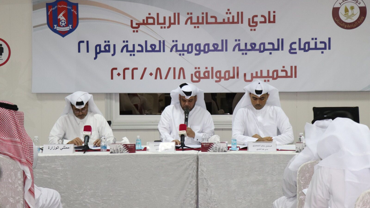 يعقد نادي الشحانية اجتماع الجمعية العمومية العادية الثانية والعشرون وذلك يوم 20 يوليو القادم بمقر النادي في تمام الساعة السابعة مساءً ولذلك لمناقشة الموضوعات المدرجة في جدول الأعمال وهي، التصديق على محضر الاجتماع السابق المنعقد بتاريخ 18/8/2022ومناقشة تقرير رئيس…